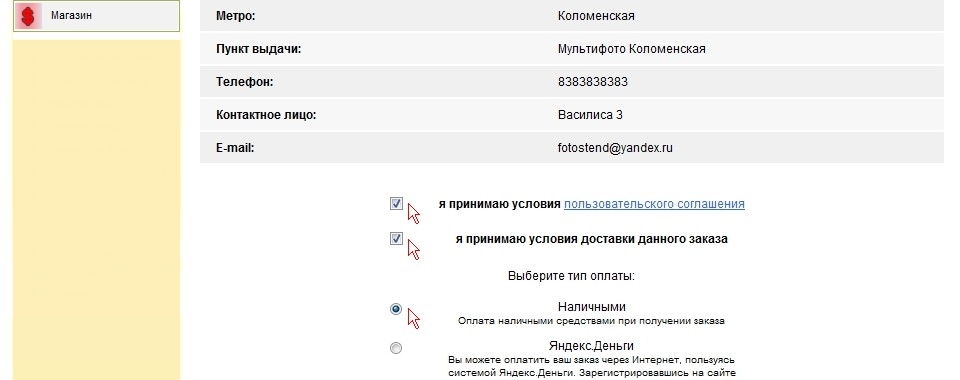 Вариант заполнения страницы при оплате наличными на пункте выдачи.